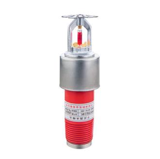 干式洒水喷头由框架组件、玻璃球、密封件、内外装饰盘、外接管、密封座圈等组成。平常系统中的干式喷头处于正常状态,进水口的密封堵使系统中的水无法到干式喷头配管内,当火灾发生时,喷头玻璃球感温元件受热并达到动作温度后,玻璃球破裂后使底座脱落,同时干式喷头的管道内部机构释放,从而让水流出,启动喷头洒水灭火。