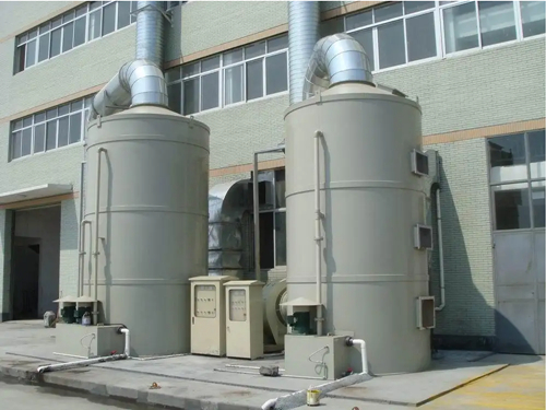酸雾净化塔结构设计:净化塔处理段采用圆形双筒体和单筒体相结合的综合结构。为增加强度,塔体外壳采用了若干纵向加强筋,并根据各种型号的体型大小,采用分段分片组装,外壳体拼装采用碳钢镀塑螺栓,螺栓的色泽和塔体色泽相同,这种设计连接既美观、大方又保证连接强度及防腐要求。下塔增设方形水泵座既作为循环贮液箱,又可安装循环喷淋泵。因此,这样的结构设计,不但占地面积少,而且使用管理十分方便。同时避免了一般卧式泵容易漏液的现象。