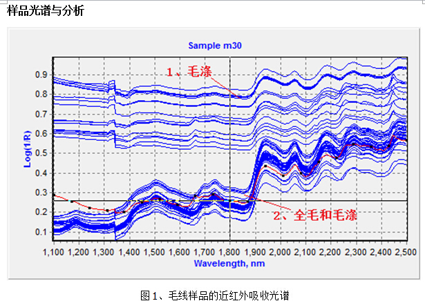 通过对样品近红外吸收光谱的观察,可以初步分析出其中一种毛涤和全毛的区别,1和2是两种不同的毛线。