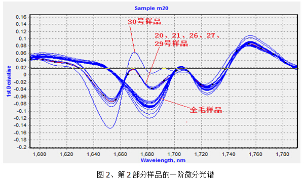 通过图2、3可以看出:第20、21、26、27、29号样品为毛涤样品,但与其他毛涤不大相同。它们更接近于全毛样品。第30号样品是一个特殊的样品,与毛涤相似,且与毛涤又有区别。
