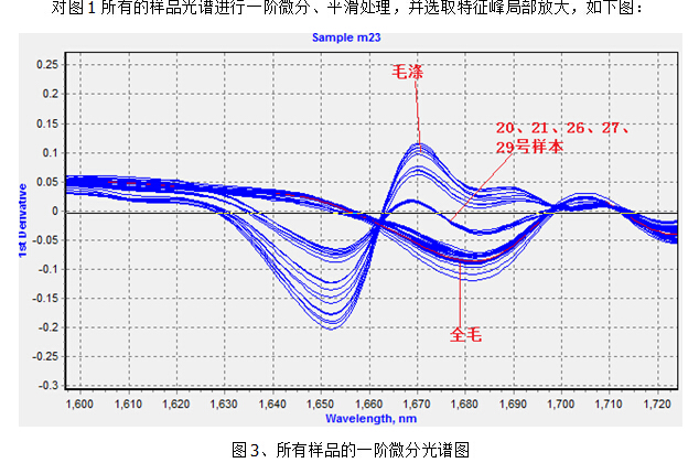 由于这三种类型的样品差异较大,所以在建立定标模型过程中,我们要分别对这三种样品建立模型;由于毛涤每种类型的样品量较少,后期需要补充样品量即可建立出较完善的模型。通过分析,在盲样中,第26、27、29为一种毛涤,28为另一种毛涤、30为第三种未知类型样品。本实验只对毛涤样品建立定标模型,并对4个未知毛涤样品(26、27、28、29号)进行盲测。