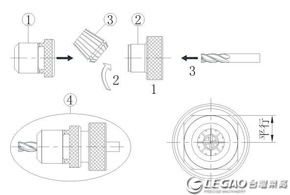 固定夹头螺帽放入长度定位座孔内,密接后顺时针方向,向右旋转定位,铣刀先插入底部后,轻推碰到平面向右卡住定位。夹头座向右转到底锁紧,取出时握住固定夹头螺帽微微向左旋转后取出。