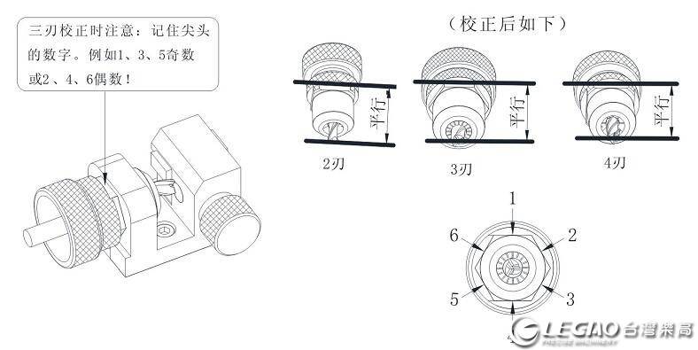 修磨3刃铣刀时:靠后角座数字跟对刀座相反(例如:对刀座数字是1、3、5,相反靠后角数字是2、4、6)左右旋转研磨即可。