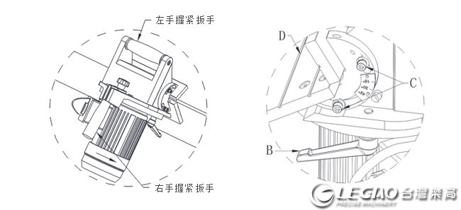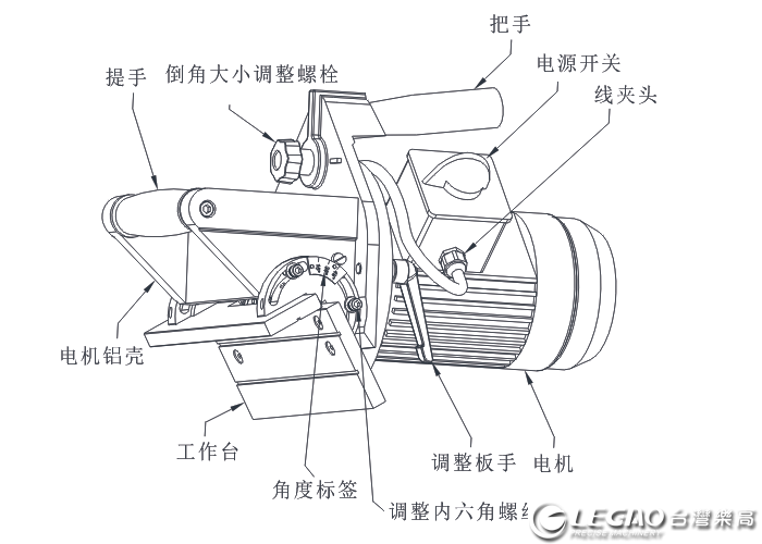 如果倒角的大小不合适,需要调整时,应先关闭电源开关,方可进行调整。先松掉调整扳手与上图调整扳手,再调到倒角大小调整螺母,看刻度表至相应大小,最后锁紧调整扳手。拿取电机壳