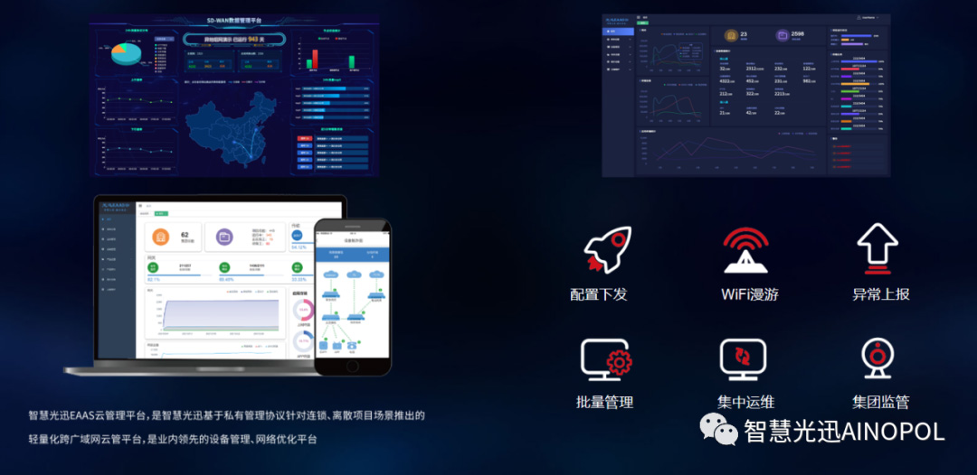 智慧光迅EAAS云管理平台,是智慧光迅基于私有管理协议针对连锁,离散项目场景推出的轻量化跨广域网云管平台,是的设备管理,网络优化平台。
