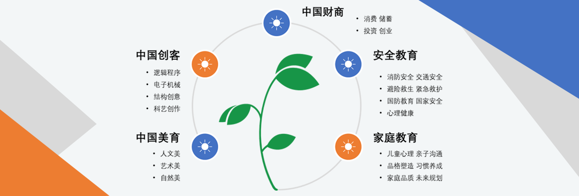 主要分为中国创客、中国财商、中国美育、家庭教育、安全教育等五大模块,以3+1+1模式建构。贯穿中国学生发展核心素养,以培养“全面发展的人”为核心,融合六大素养,最终培养具有终生学习、科学精神、文化价值、实践创新、责任担当、健康生活(感恩的心)品格的未来国际化中国人。