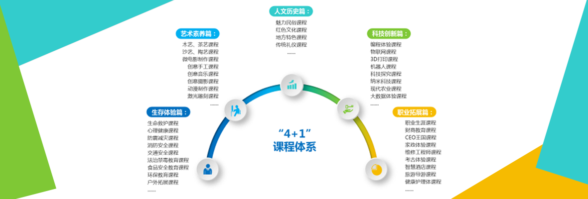 以《综合实践活动指导纲要》为指导,结合本土文化特色,按照“课程主线——场馆课程——活动项目”的序列,设置生存体验、艺术素养、科技创新、职业拓展等四大主题的课程活动,并开创性地融入人文历史主题课程活动,形成创新“4+1”大课程体系。