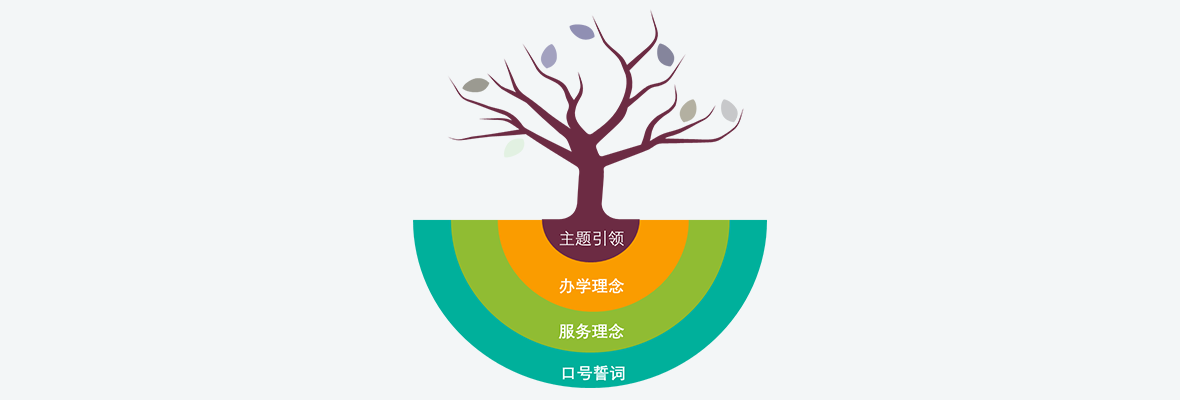 理念文化作为文化建设之根,对内激励师生发展、对外展示价值追求,是为教育内涵设计铸魂。其从顶层上贯穿、指引文化系统建设;在传承地域教育特色、文化精髓的基础上,充分整合人文历史、自然生态与文化,创新文化建设策略。