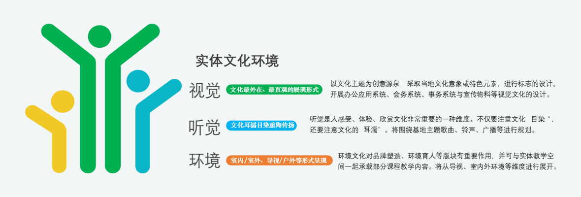 在理念文化指引下,以统一性、系统化、显性化的视觉、听觉与环境文化建设,直观传递文化张力,关联课程体系育人导向,突出文化精神内涵与环境的教化、熏陶作用,使整体育人体系更具完整性、系统性、特色性、艺术性。
