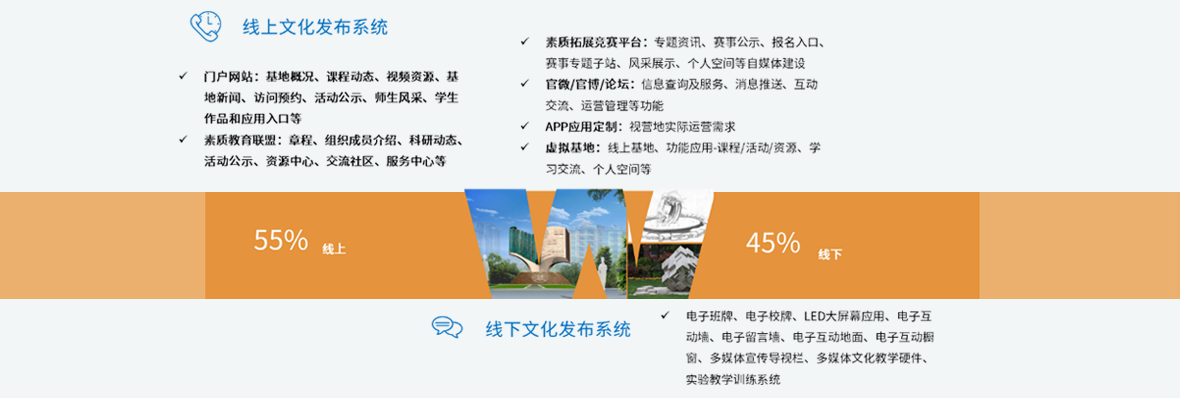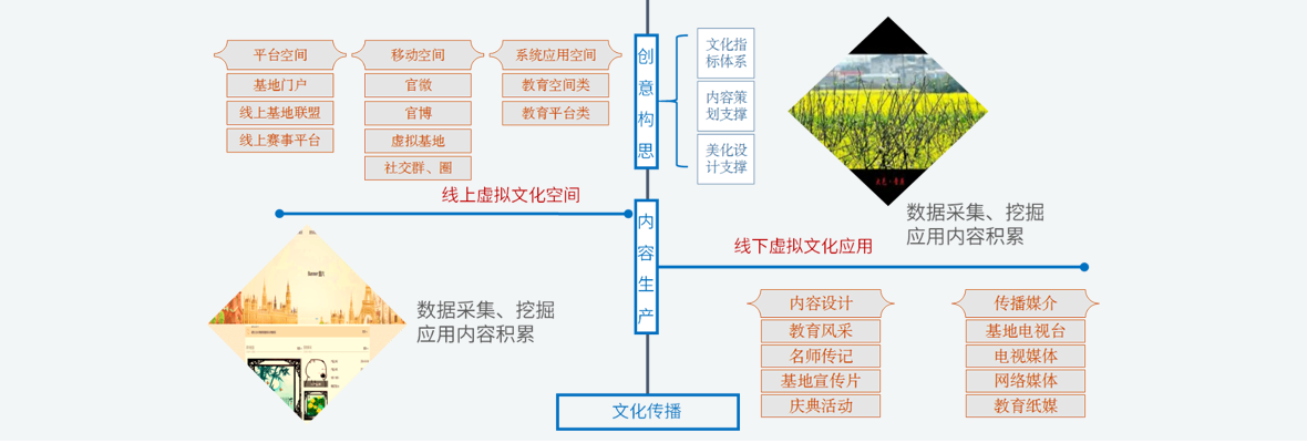 主要包括线上虚拟文化空间与线下虚拟文化应用两个子系统,提供文化建设支撑(内容策划、美化设计等),增强文化应用效果与影响力;基于智慧基地(智慧校园)现代化技术手段,高效展现文化建设风貌,大幅提高文化建设的线上应用与宣导效果;并为教育品牌文化宣传提供线下的内容制作服务(影像、平面等)与传播媒介资源。