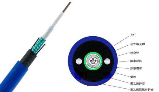 2、层绞式: 由内到外依次为中心加强件(一般用磷化钢丝),光纤,光纤膏,松套管,扎带,缆膏,钢带,PE内护层,阻燃护套(蓝色)