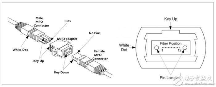 MPO光纤连接器包含了光纤、护套、耦合组件、金属环、引脚、防尘帽等,而且引脚部分分为公头和母头两种形式。公头连接头有两个PIN针,而母头连接头则没有。MPO连接器之间的连接是通过PIN针进行精确对准的。在对接连接器时,装在插芯尾部的弹簧会对插芯提供一个推力,使其与适配器锁死。连接器主体的一侧有一个"键",有"凹凸"之分,用于限制连接头的相对位置,即P1,P2等。在连接器主体侧有一个称为"白点"的标记,用于指定连接器的插入侧。
