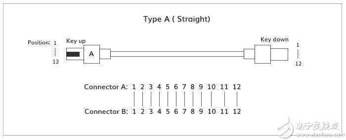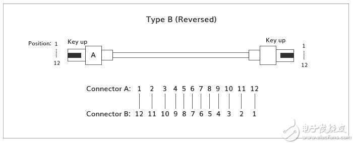 Type B(交错型):跳线两端纤芯排列位置是相反的,即一端的1对应另外一端的12,一端的12对应的是另外一端的1。 两端的key键朝向是相同的,即key up就对应 key up, key down 就对应 key down。