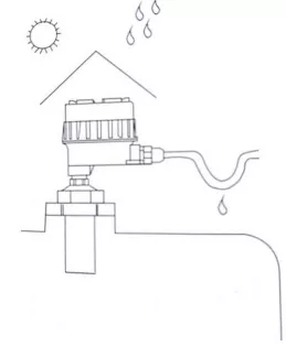 对于安装在室外或潮湿室内及制冷或加热的罐上的仪表,为了防潮,应拧紧电缆密封套,而且要在进线口处使电缆向下弯曲。如图示