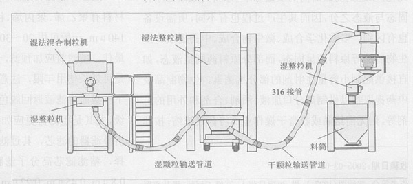 3.1.2在三相制粒机的出料口连接湿法整粒机、整粒后湿粒经不锈钢斗进入软管内,经真空吸入沸腾干燥机内干燥。
