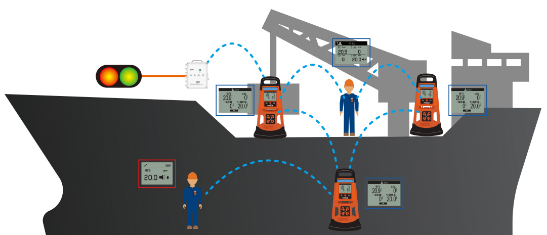 维修和检修:在船舶的维修和检修过程中,移动式气体检测仪可以放置在工作现场,用于持续监测。拥有无线互联功能的Radius BZ1区域监测仪更可以组成一个安全网络,任何一个位置报警,网内的其它设备也会联动报警。如果现场工人佩戴了也拥有无线功能的Ventis Pro5便携式气体检测仪,那么工人的仪器也可以联动报警。维修人员可以使用它来确保工作区域的气体浓度处于安全范围内,以保障自身的安全。同时如果配置了RGX无线网关,可以通过继电器输出8路开关信号,自动控制喷淋排风等安全设备。