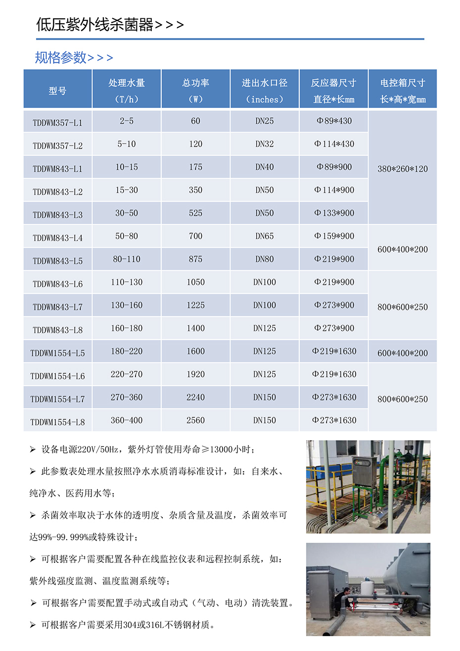 紫外线杀菌器的规格参数表,流量范围从2吨到400吨每小时不等,可以满足不同规模的水处理需求。一般来说,大型的管道式紫外线消毒器可以处理更大的流量,但也需要更高的能耗和更大的空间。客户需要根据项目的实际需求选择合适的管式紫外线消毒器。