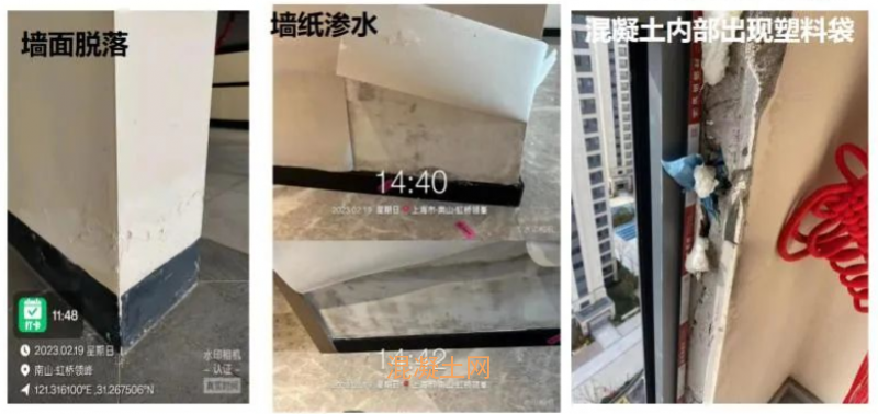 据购房者孟晓倩反映,上海嘉定区开发的南山虹桥领峯实际交付时存在明显“货不对板”:外立面施工凹凸不平,楼梯间漏水,墙体的混凝土里疑似掺杂了塑料袋。业主们多次投诉后,开发商同意进行整改,但整改工程却迟迟不见推进。