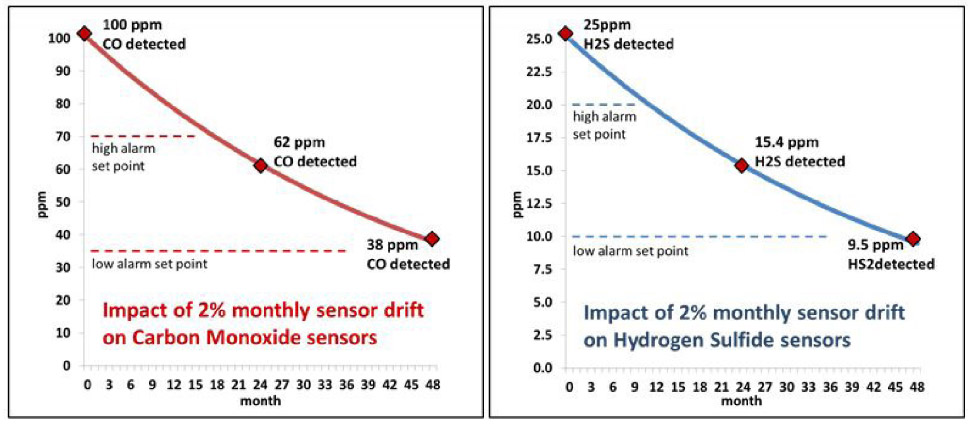 单独2%的月度传感器漂移的复合效应导致24个月后读数降低38%,48个月后的读数降低62%。换句话说,两年后,暴露于100ppm CO和25ppm H2S的危险环境中的仪器可能显示62ppm CO和15.4ppm H2S。
