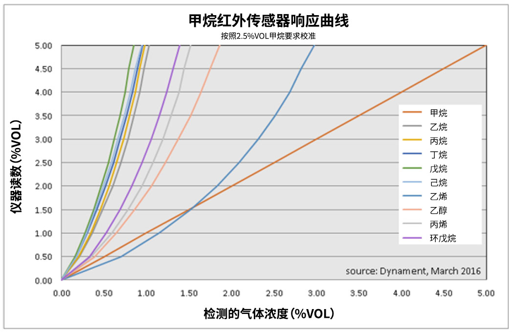 甲烷红外传感器(CH4 IR) 对于甲烷之外的其它气体,甲烷红外传感器的响应非线性程度很大。例如,如果存在甲烷气体,甲烷红外传感器可产生线性响应,如果出现的是戊烷,读数将高于实际LEL数值。这种传感器对于其它气体会产生非线性响应,所以无法像催化燃烧式传感器那样利用简单标定系数修订读数。传感器对于甲烷的整体敏感度很好,因此适合用于0至99%体积浓度甲烷的检测。请参见以下图示,其中展示了甲烷红外传感器对于其它相关气体的非线性响应特性。