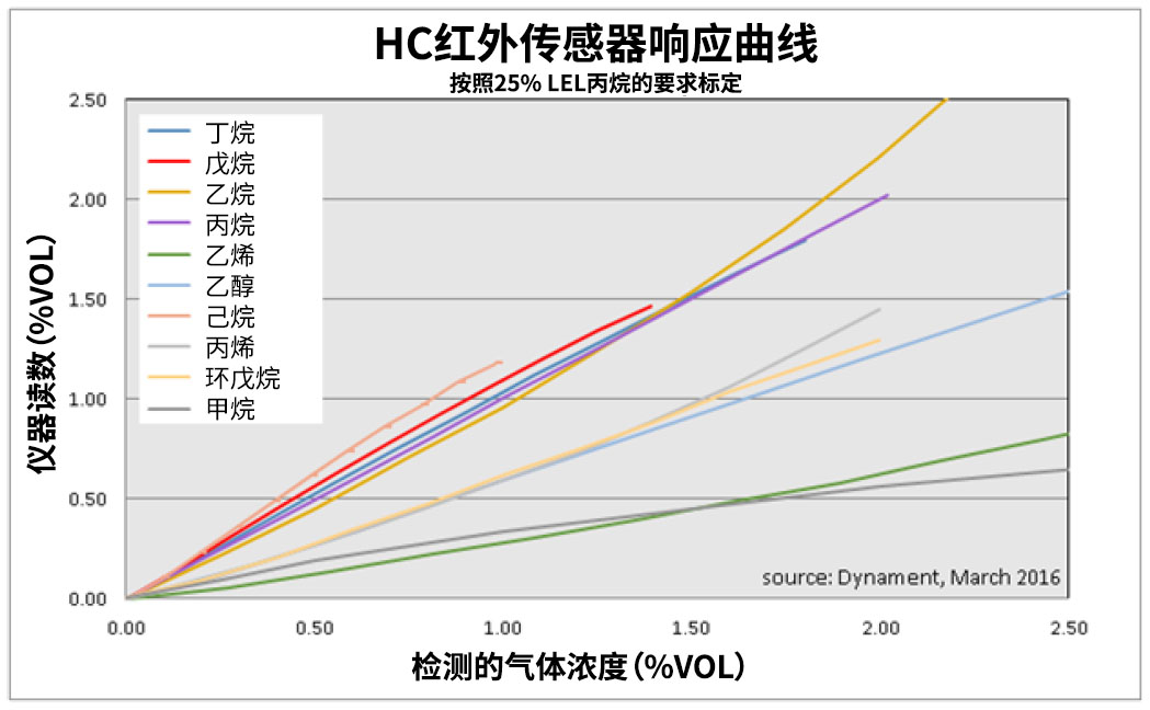 可燃气体红外传感器(LEL IR)与甲烷红外传感器不同,如果可燃气体红外传感器根据丙烷的要求进行标定,对于其他可燃气体的响应线性程度更高。图中所示为可燃气体红外传感器对于常见可燃气体的响应情况。