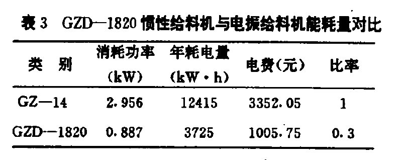 3.1 GZD-1820愤性给料机与GZ-14电振给料机能耗量对比及分析见表3.