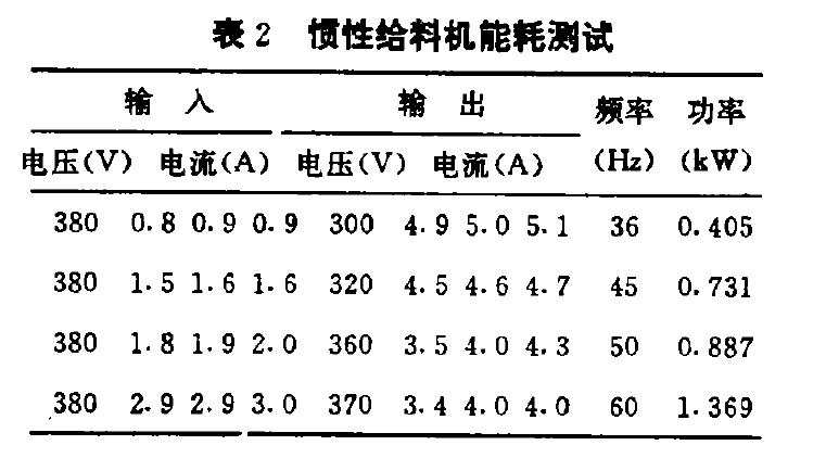 在表3中:①年耗电量按4200h/a计算,电费单价按0. 2?元/kw·h计;②电振给料机的功率计算方法是按单相交流供电,电流19A,计算出消耗功率2. 956kwo③电振给料机使用220V单相脉动直流供电,低、能耗大,而且造成电网不平衡,供电不合理,属淘汰产品。