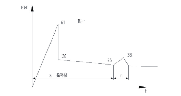 该机电机功率为37KW,速度V=0.08m/s,板式给料机为带料启动.该机不允许卸空状态下运行.从图一的功率消耗图中可以看到,当板式给料机启动时所消耗的功率为61 KW,启动时间为3秒钟.在翻斗一车将矿石倒入料仓时产生了33KW的峰值,链板运行所消耗的功率为28-25KW。