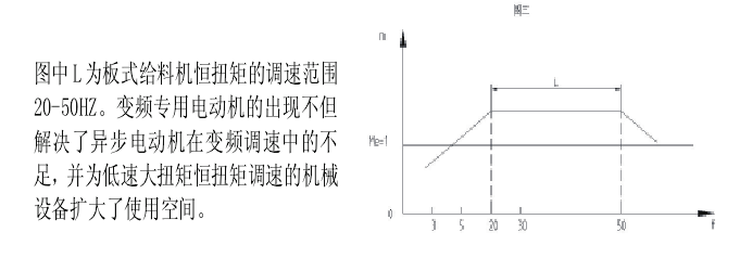 为适应恒转矩负载的要求(额定频率50HZ以下的调速),专业厂家设计生产了变频专用电机(称之为VF电机),其特点是在变频调速时所包络的转矩范围正适合板式给料机的调速范围(见图三),并能和受料设备进行联锁,实现近程DCS控制。