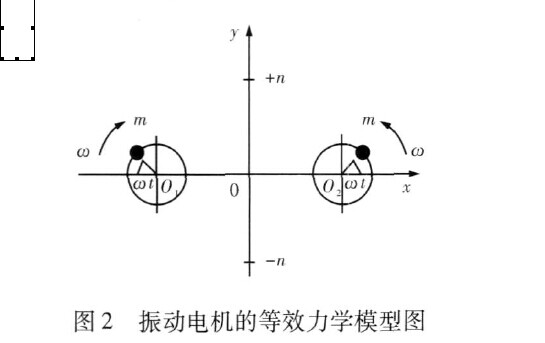 图2为振动电机的等效力学模型图,当两个振动电机内质量相等的偏心块m以相反的角速度同时旋转时,其在x轴上激振力分力互相抵消为零;由于振动方向角己在坐标的oyz的相限内,且改45 ,故在坐标Y轴及z轴上的激振力分力是叠加的。如Y轴方向上的分力是由零变为正向的一定值几再降为负向的一定值几后又回到零,即一个等幅振动周期。在这样的设置下,激振产生有限个交变的激振力对物料进行抛掷,达到输送物料的目的。