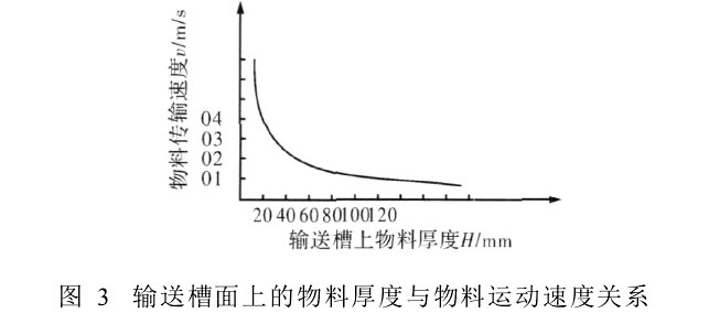 振动输送给料机输送的物料,在其输送槽1面形成的物料层的物理几何特性是有一定的规律的。为了达到高效的、按照设定的速度来输送一定物料量的工艺要求,给料量在输送槽1上的物料厚度与其输送的速度成反比双曲线函数。如图3所示,在输送槽1上的物料厚度越薄,输送速度越快,反之越慢。