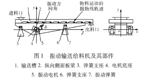 如图1所示的振动输送给料机由输送槽L纵向侧面板梁2、弹簧支座3、电机底座4、振动电机5、弹簧支座6、振动弹簧7等组成。输送槽1上设有进料口和出料口,物料由进料口进入后,在振动输送给料机直线往复式的振动过程中,被激振力抛掷起,以抛物线状的波形沿着输送槽1运动到出料口。振动输送给料机两边的纵向侧面板梁2的外侧各安装有一台振动电机5两台振动电机按一定角度反方向旋转。