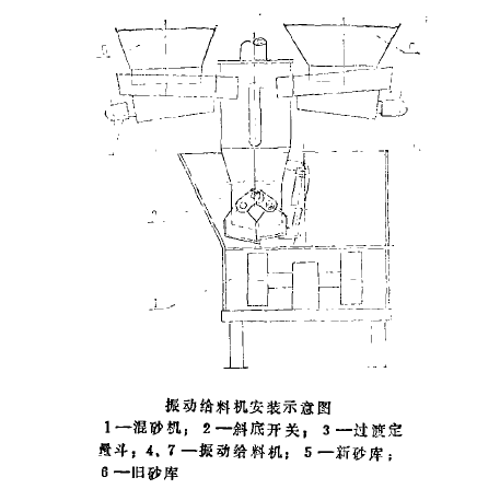 目前混砂机上新旧砂的给抖设备有栅格式给料器,圆盘给料器,星形给料器等,定量设备有栅格式定量器,杠杆式定量器及电子秤称量斗等。给料与定量很少结合在一起使用。我厂在小件车间设计的一套砂处理和混砂系统中,采用振动给料机作为混砂机给料与定量设备,把给料与定量结合使用,效果很。