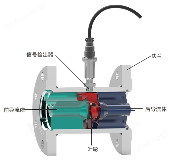 流体流经传感器壳体,由于叶轮的叶片与流向有一定的角度流体的冲力使叶片具有转动力矩,克服摩擦力矩和流体阻力之后叶片旋转,在力矩平衡后转速稳定,在一定的条件下,转速与流速成正比,由于叶片有导磁性,它处于信号检测器的磁场中,旋转的叶片切割磁力线,周期性的改变着线圈的磁通量,从而使线圈两端感应出电脉冲信号,此信号经过放大器的放大整形,形成有一定幅度的连续的矩形脉冲波,可远传至显示仪表,显示出流体的瞬时流量或总量。