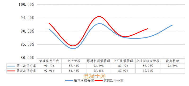 第四次评估期间北京市正常生产的预拌混凝土搅拌站企业及站点有97家,评估内容包括管理信息平台、生产管理、原材料质量管理、出厂质量管理、企业试验室管理以及预拌混凝土原材料和混凝土试块(拌合物)抽检。评估现场检查平均得分为89.7分,样品抽检得分率为96.94%。