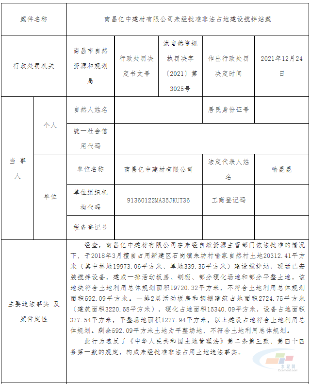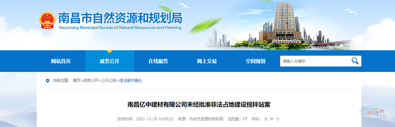 12月28日,江西南昌市自然资源和规划局网站公布了南昌亿中建材有限公司未经批准非法占地建设混凝土搅拌站案的查处情况。