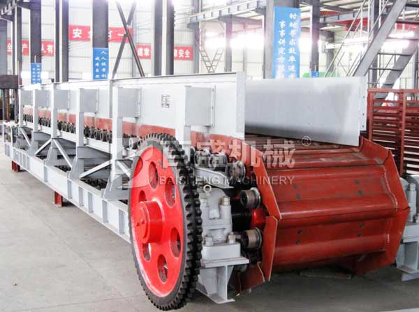 重型板式给料机是将电动机的动力,经过联轴器和减速器驱动链轮轴旋转通过链轮齿与链条销轴啮合,拖动链板作连续直线运动。链板由安装在机架上的支重轮与托轮支承,并通过调整拉紧装置使其链条与链轮正确啮合,完成输送物料之目地