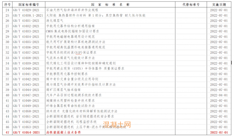 2021年12月31日,国家、发布《关于批准发布<全息位置地图数据内容>等530项推荐性国家标准和2项国家标准修改单的公告(2021年17号)》,由中国建筑科学研究院有限公司主编的国家标准《高性能混凝土技术条件》GB/T 41054-2021正式发布,并将于2022年7月1日实施。
