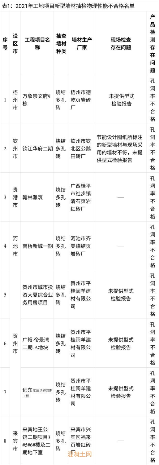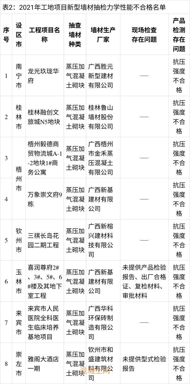 日前,广西壮族自治区住房和城乡公布2021年房建市政工程项目使用新型墙体材料产品质量及混凝土结构实体质量抽查结果。