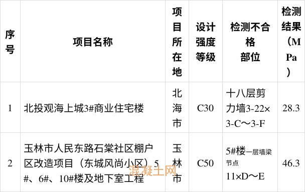 2021年混凝土结构实体强度抽测不合格项目一览表