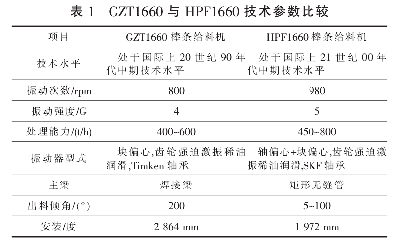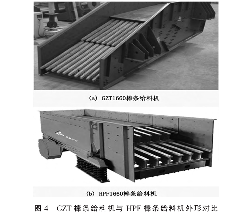 HPF棒条给料机是南昌矿机的新型产品,与GZT棒条给料机相比较,具有更的机械性能,可以作为GZT棒条给料机的替代方案。且相关的对比数据可以看出,HPF棒条给料机比GZT棒条给料机更、更稳定、更适用于铜渣选厂的粗级给料。GZT棒条给料机与HPF棒条给料机外形对比见图4。技术参数比较见表1。
