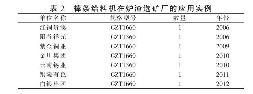南昌矿机的GZT棒条给料机广泛地应用于有色和黑色矿山,同时也在铜炉渣选矿厂占有一定技术优势。近年来,GZT棒条给料机在铜炉渣选矿厂的应用情况见表2。