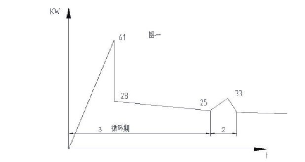 该机电机功率为37KW,速度V=0.08m/s,板式给料机为带料启动.该机不允许卸空状态下运行.从图一的功率消耗图中可以看到,当板式给料机启动时所消耗的功率为61 KW,启动时间为3秒钟.在翻斗一车将矿石倒入料仓时产生了33KW的峰值,链板运行所消耗的功率为28-25KW.