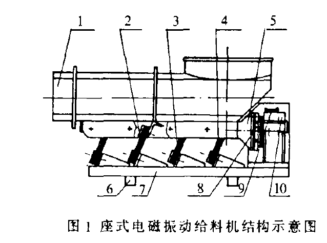 座式电磁振动给料机的结构如图1所示,在料槽l的下面装有推力板5,在推力板5与底座7之间装有玻璃钢板弹簧3,根据给料机大小不同,玻璃钢板弹簧的组数可不同,每组弹簧之问用垫片4相隔,并以70°的倾角用螺栓及压板4将其一端固定在推力板5上,另一端则固定在底座7上,在底座7的下面装有橡胶减振器6,衔铁8装在推力板5的后端,线圈9和铁心10装在底座7上。