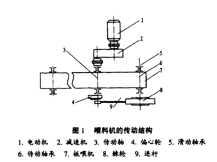 某公司余热电站燃料制备破碎系统煤研石给料设备采用BW 1200 x 4000mm板式喂料机。其传动结构如图1所示,采用电动机带卧式减速机及棘轮间歇传动方式。因结构复杂,两根传动轴采用滑动轴承,运行中存在很多问题,保证不了生产的正常运行。