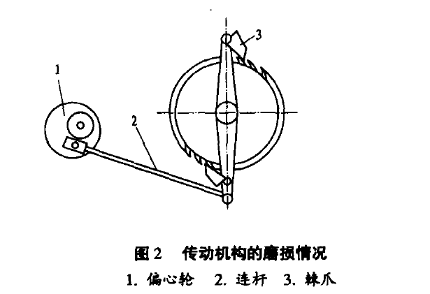 (2)如图2所示,在运行中棘轮、棘爪、连杆由于间歇运动冲击负荷较大,磨损严重,而且传动偏心盘、连杆因冲击经常损坏。
