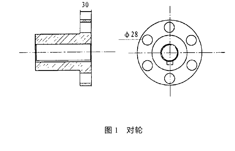 在不改变原对轮技术标准的前提下,对轮壁厚由原15~增至30mm;对轮联接销的孔径由原来的12~改为28mm,与电机对轮孔径统一规格;对轮加工的材质由铸铁改为铸钢,对轮结构图如图1。