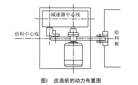 K型们复式给料机是煤矿运输、选煤系统中常用的一种给料设备,其工作原理:电动机通过联轴器驱动减速器,减速器输出轴带动曲柄一连杆机构,曲柄一连杆机构带动给料板作们复运动,将煤从仓内给出。由于该设备选用的是单输入、单输出的减速器,而且输入、输出都在同一侧,这样给料板的工作阻力经连杆、曲柄反作用于减速器的侧而输出轴上,该反作用力与作用点至减速器中心线的力臂构成的单臂力矩自接作用在减速器上(图1)。因此,经常造成减速器、电动机左右扭动,底爪断裂;传动架开焊、断裂;联轴器损坏等故障。设备故障的频繁发生自接影响到矿井的正常生产,同时还大大地增加了设备的维修费用,严重地影响了企业经济效益的提高。