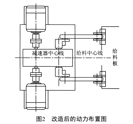 为解决单臂传动所带来的各种弊端,经过对原K型往复式给料机的技术分析,改造措施如下:传动部分由单侧单臂布置改为双侧双臂布置,使减速器中心线与给料板中心线一致;单曲拐臂(连杆)传动改为双自臂(连杆)传动;减速器由单输入、单输出改为双输入、双输出;电动机由1台工作改为1台工作1台备用,备用电动机备用时联轴器销轴小装,随用随装(图2)。当然,使用单输入双输出的减速器,配1台电动机或使用双输入双输出的减速器,配2台小功率电动机同时工作,也是可行的,只是当电动机出现故障时,修理或更换电动机对正常生产稍有影响。