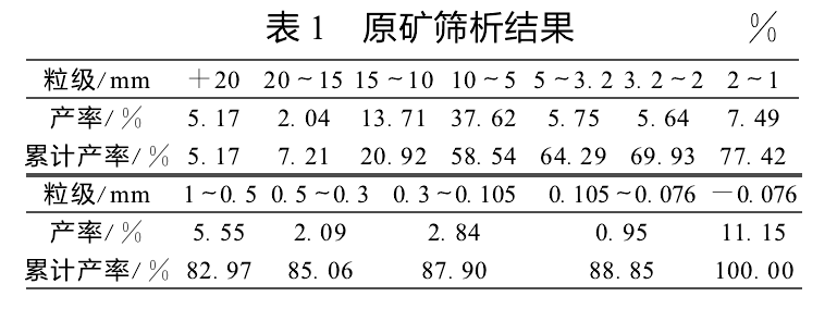 设计输送的物料为铜坑矿破碎至20 mm原矿石。经测定原矿的物理参数为:2. 89 t/m3;松散密度:1. 84 t/m3;原矿筛析粒级组成见表1。